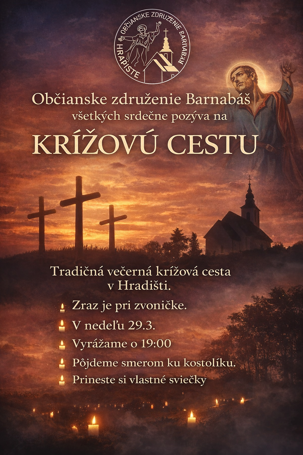 • V Skačanoch bude dnes birmovanecká Krížová cesta o 14.00, v Návojovciach bude Krížová cesta o 15.00 a v Hradišti je Krížová cesta o 19.00 a pôjde sa peši od zvoničky ku kostolu. Srdečne Vás pozývam na Krížové cesty.