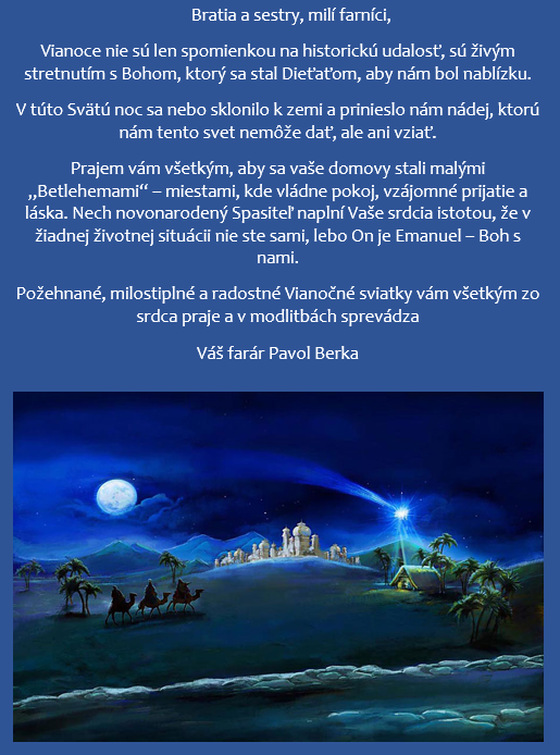 Ďakujem všetkým Vás, ktorí ste sa akýmkoľvek spôsobom pričinili o slávnostný a pekný priebeh VIANOC. Ďakujem za upratanie kostolov a za zdobenie stromčekov. Ďakujem kostolníkom, organistom, dychovkám, miništrantom a lektorom. Veľké Pán Boh zaplať pánovi Ľubomírovi Šujanovi, ktorý daroval vianočné stromčeky do všetkých kostolov farnosti.