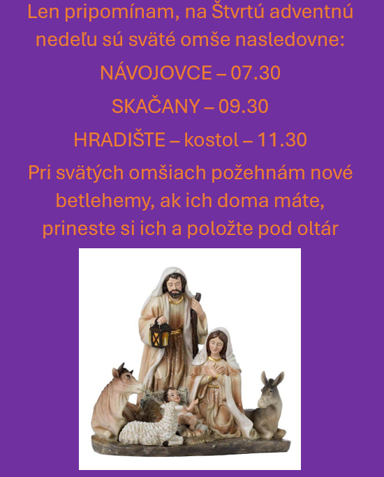 Na Božie narodenie bude o 15.00 bude JASLIČKOVÁ POBOŽNOSŤ v Skačanoch. Všetci ste srdečne pozvaní.